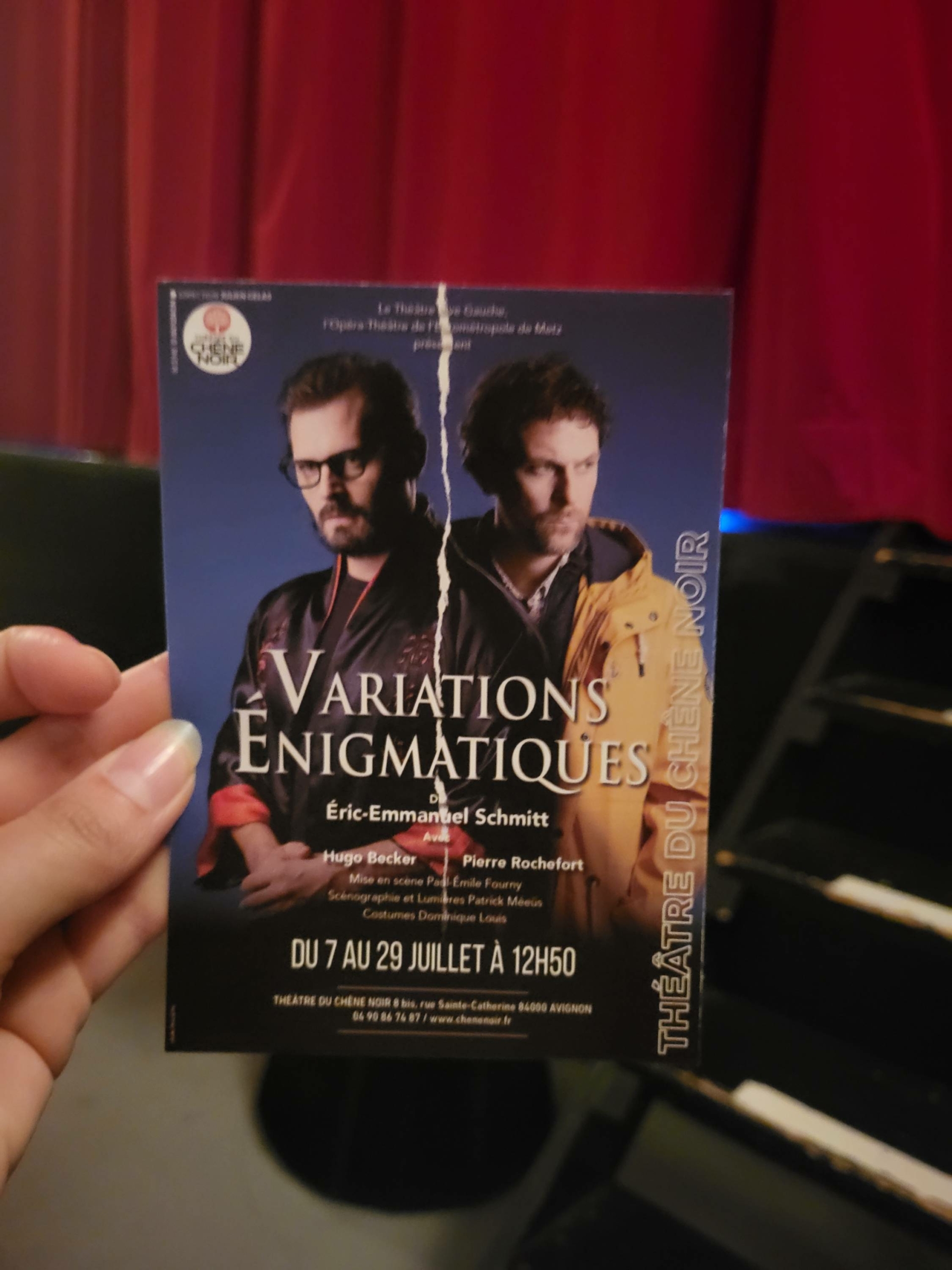 J’ai ensuite découvert la pièce de théâtre Variations énigmatiques d’Eric Emmanuel Schmitt avec les talentueux comédiens Hugo Becker et Pierre Rochefort. Deux hommes s’affrontent sur le thème de l’amour, un est journaliste et trouve le prétexte de rencontre l’autre, un prix Nobel de la littérature qui vit coupé du monde, sur une île perdue de Norvège. Emotions, retournements de situation incroyables, un beau jeu d’acteur qui m’a fait vibrer jusqu’à la fin. J’ai adoré cette pièce de théâtre !